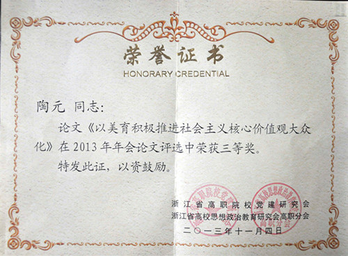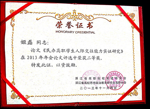 在2013年浙江高职党建研究会年会论文评选中,我院姬磊同志论文《民办高职学生人际交往能力实证研究》荣获二等奖;陶元同志论文《以美育积极推进社会主义核心价值观大众化》荣获三等奖。