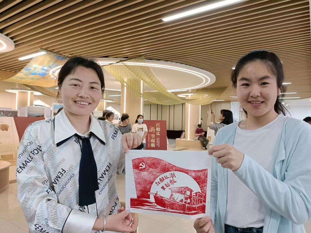 展览中还开设了红色文创专区,为大家提供了版画印制“红船起航”,体验制作“信仰”和“前途光明”书签等体验活动。