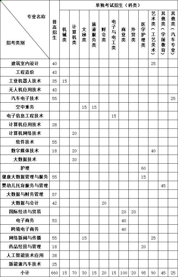 第八条 招生专业、科类及计划。招生专业24个,招生计划1200名。其中面向普高招生考生计划660名,面向单独考试招生考生计划540名,学制均为三年,具体专业计划如下表: