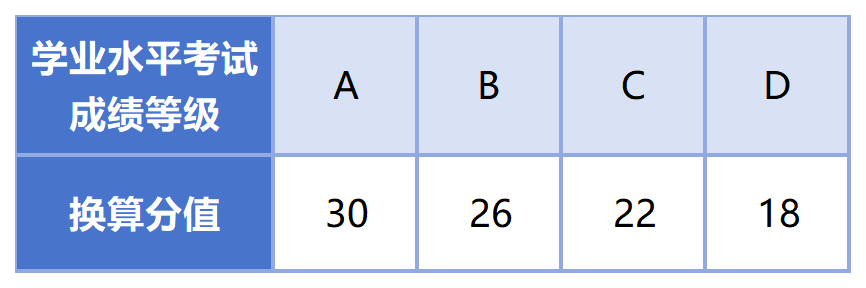 普高招生考生高中学考成绩(满分300分)=各科成绩等级换算分值相加的总和(信息技术与通用技术学考分设的考生,信息技术与通用技术成绩等级换算分值以50%计)。各科成绩等级转换成分数如下表所示: