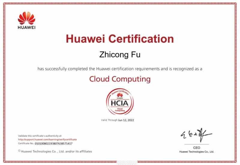华为认证是华为技术有限公司围绕“云-管-端”协同的新ICT技术架构,打造的业界唯一覆盖ICT全技术领域的认证体系,包含“ICT技术架构认证”、“平台与服务认证“、“行业ICT认证”三类人才标准。其中,HCIA(Huawei Certified ICT Associate)认证是华为职业认证中用于标识个人能力在某一技术领域达到工程师级别的证明,表示通过认证的人员具备安装、配置、运行 ICT 设备,并进行故障排除的能力。下图为HCIA云计算证书。