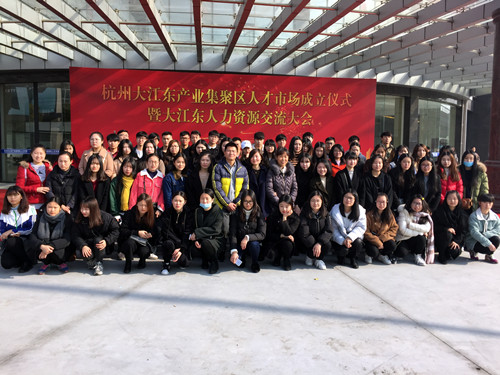之后,同学们参加了大江东人才市场的开幕式。大江东产业集聚区相关领导在开业现场致辞并一起为大江东人才市场揭牌,这也标志着大江东首家人才市场正式挂牌运营。杭州大江东产业集聚区人才市场是由大江东管委会牵头,委托东度企业管理有限公司全权管理的大江东地区唯一的人才市场,今后大江东人才市场每周末都会有小型的招聘会。学生在东度企业岗位见习期间,部分同学也会被安排到人力资源市场工作,维护整个人才市场的正常运行。